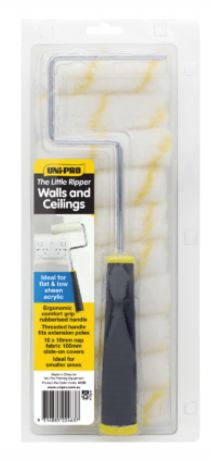 * UNi-PRO Little Ripper 100mm Frame & Roller Set 11mm Nap. - The Little Ripper 10 pack and frame is suitable for use with flat & low sheen acrylic paints. Comfort grip slide-on frame. Threaded handle fits most standard extension poles. Mini rollers are perfect for use on walls, ceilings, smaller ‘hard to reach’ areas. 10x yellow stripe fabric covers.