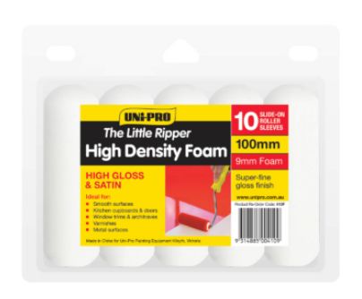 * UNi-PRO Little Ripper 100mm High Density Foam Covers 10 Pack 9mm Nap - 10 x 100mm high density foam roller covers. 9mm nap. The little ripper mini roller range combines quality components with trade fabrics to give you maximum performance and professional results. Ideal for painting smooth surfaces, kitchen cupboards & doors, window trims, architraves, varnishes and metal surfaces. High density foam is best suitable for use with high gloss and satin paints for a super fine gloss finish. Super easy to use and compatible with slide-on mini roller fram2 Pack also available.