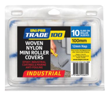 * UNi-PRO Trade 100mm Industrial Nylon Covers 10 Pack 12mm Nap. The UNi-PRO Trade range combines high quality components with trade fabrics to give you maximum performance and professional results. 10x 100mm industrial woven nylon covers 12mm nap woven nylon withstands harsh solvents. Fits 100mm slide-on frames. Ideal for use in spaces requiring a detailed finish. Perfect for concrete paths, garage and shed floors, driveways and paving. Suitable for use with epoxy resins & all paints.